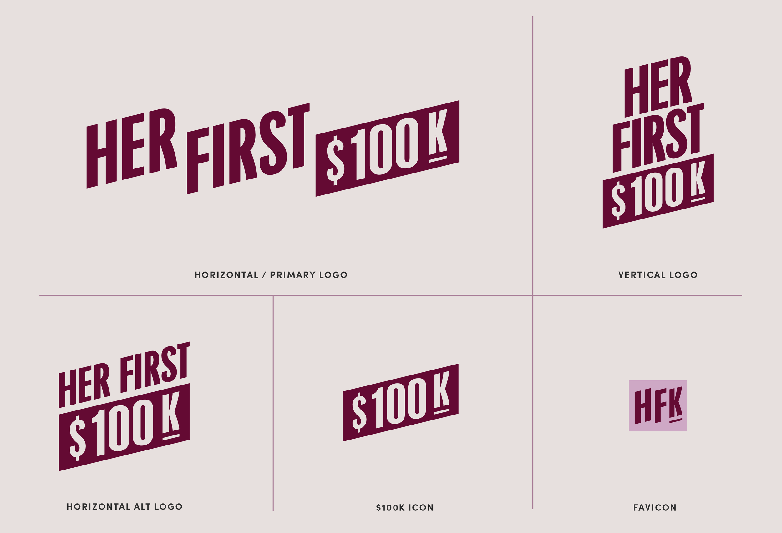 The new Her First $100K logo is a custom-built wordmark. Each letterform was thoughtfully constructed with angles and curves that correspond to communicate forward movement, upward fiscal growth and most importantly — feminine strength.