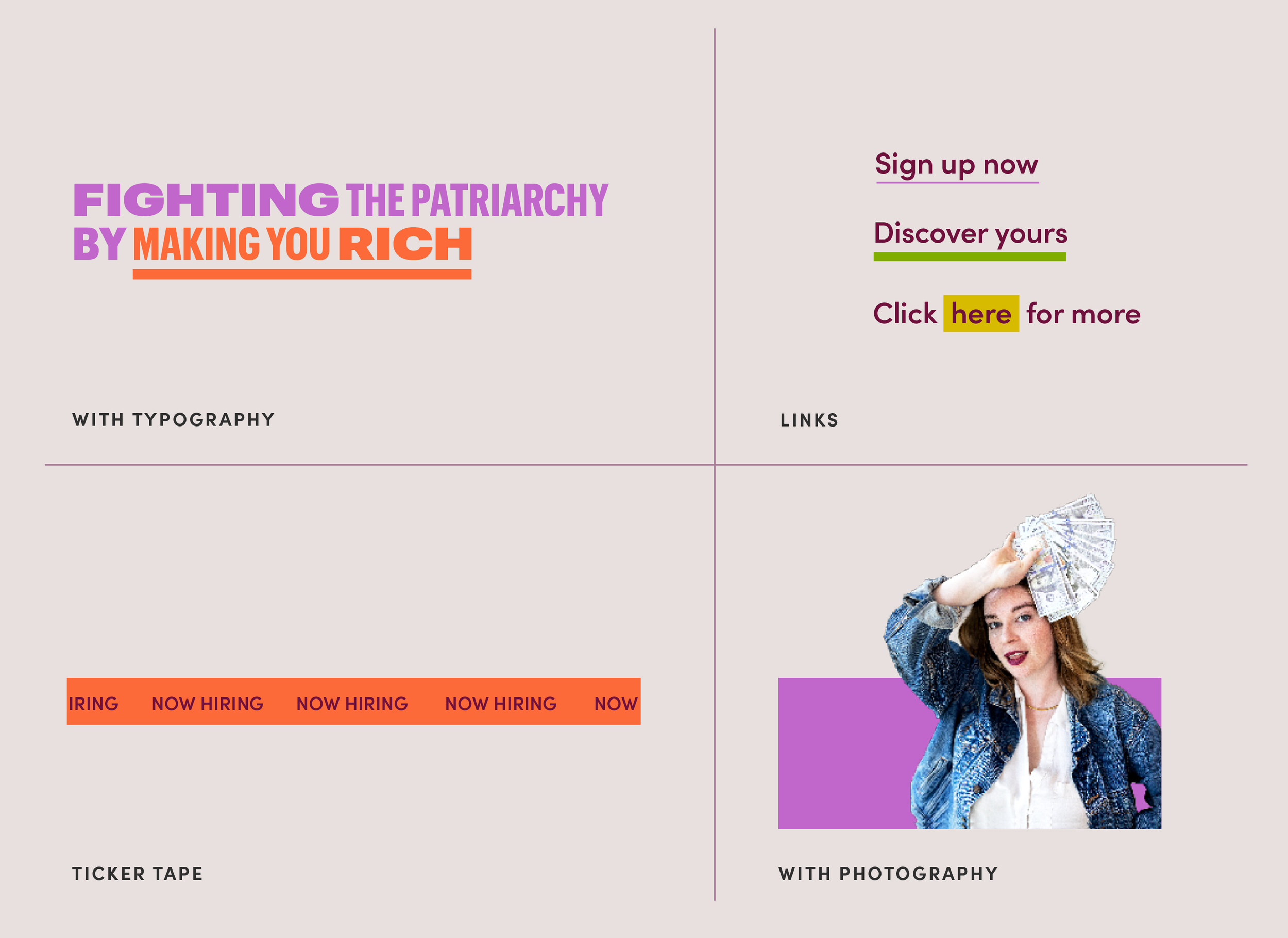 The visual language for Her First $100K rebrand is inspired by feminism first and finance second. I started by gathering contemporary expressions of Women’s Empowerment, until honing in on feminist protest poster imagery and the iconic works of Barbara Kruger.