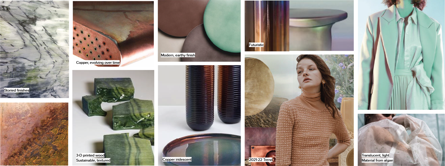 Aged patinas and oxidised metallics become a decorative feature as we place greater value on weathered surfaces which evolve over time. Combined with light, reflective materials and alternate plastics, we’re honoring our journey and lookingforward all at once.
