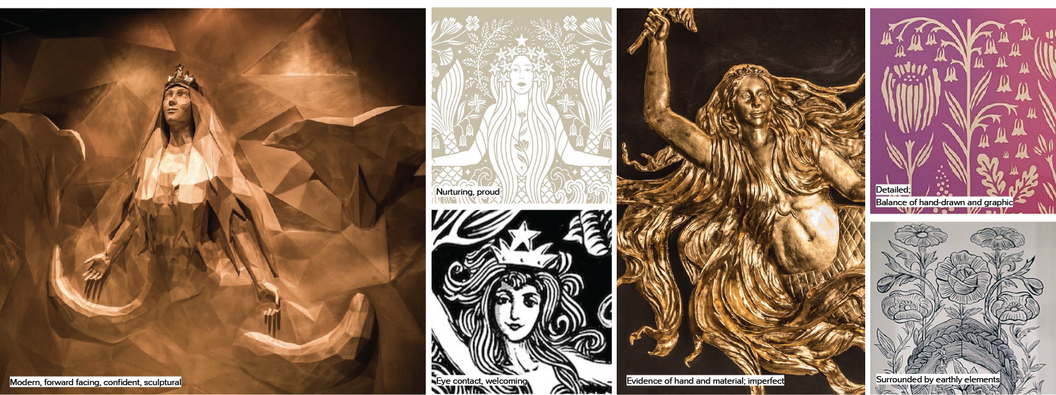 The siren illustration is nurturing and proud, almost Mona Lisa like in her smile, she is facing forward like our logo and her eye contact is welcoming and friendly. The art is hand crafted and embraces imperfections, medium is inspired by lino cuts, but less traditional.